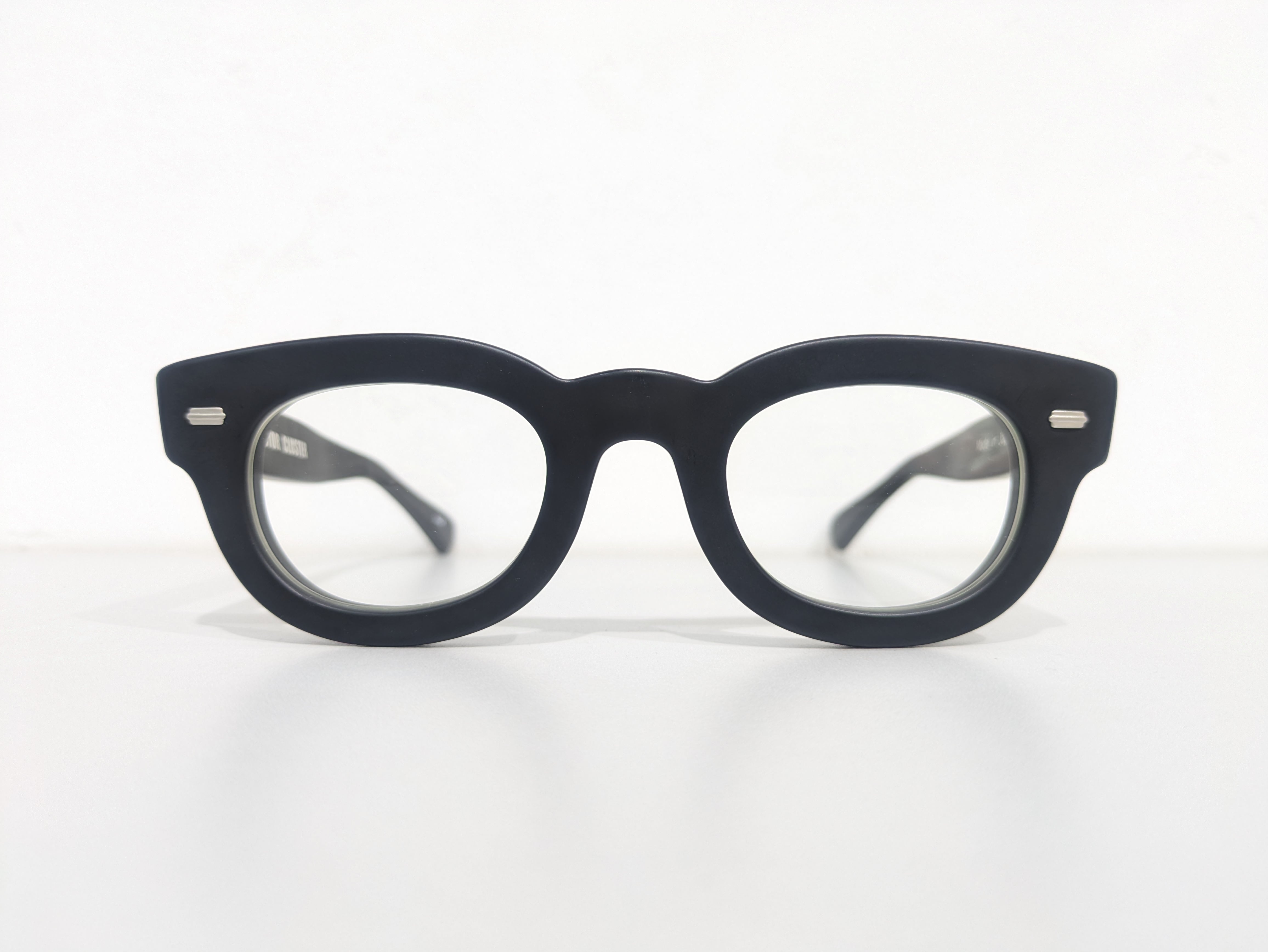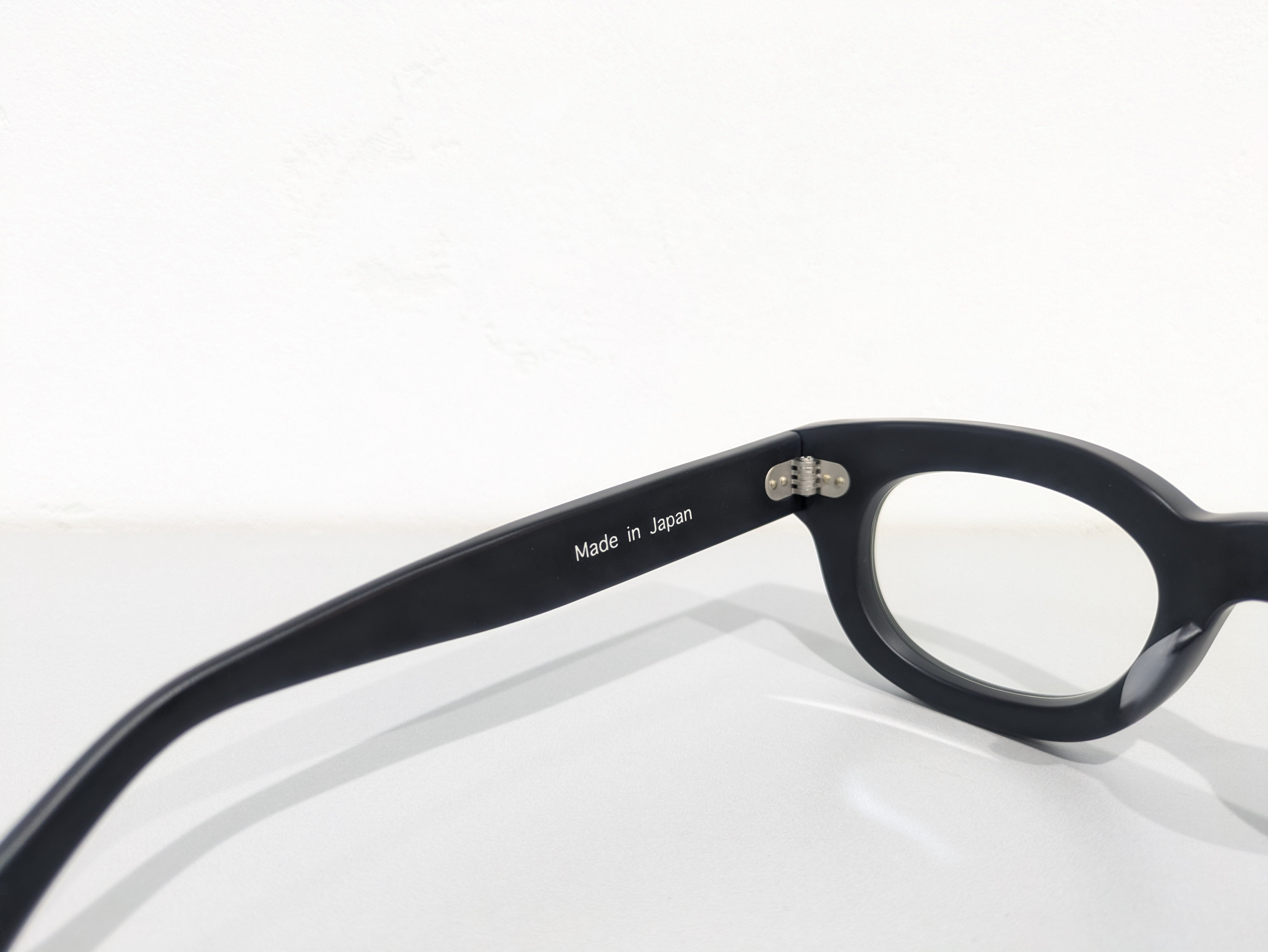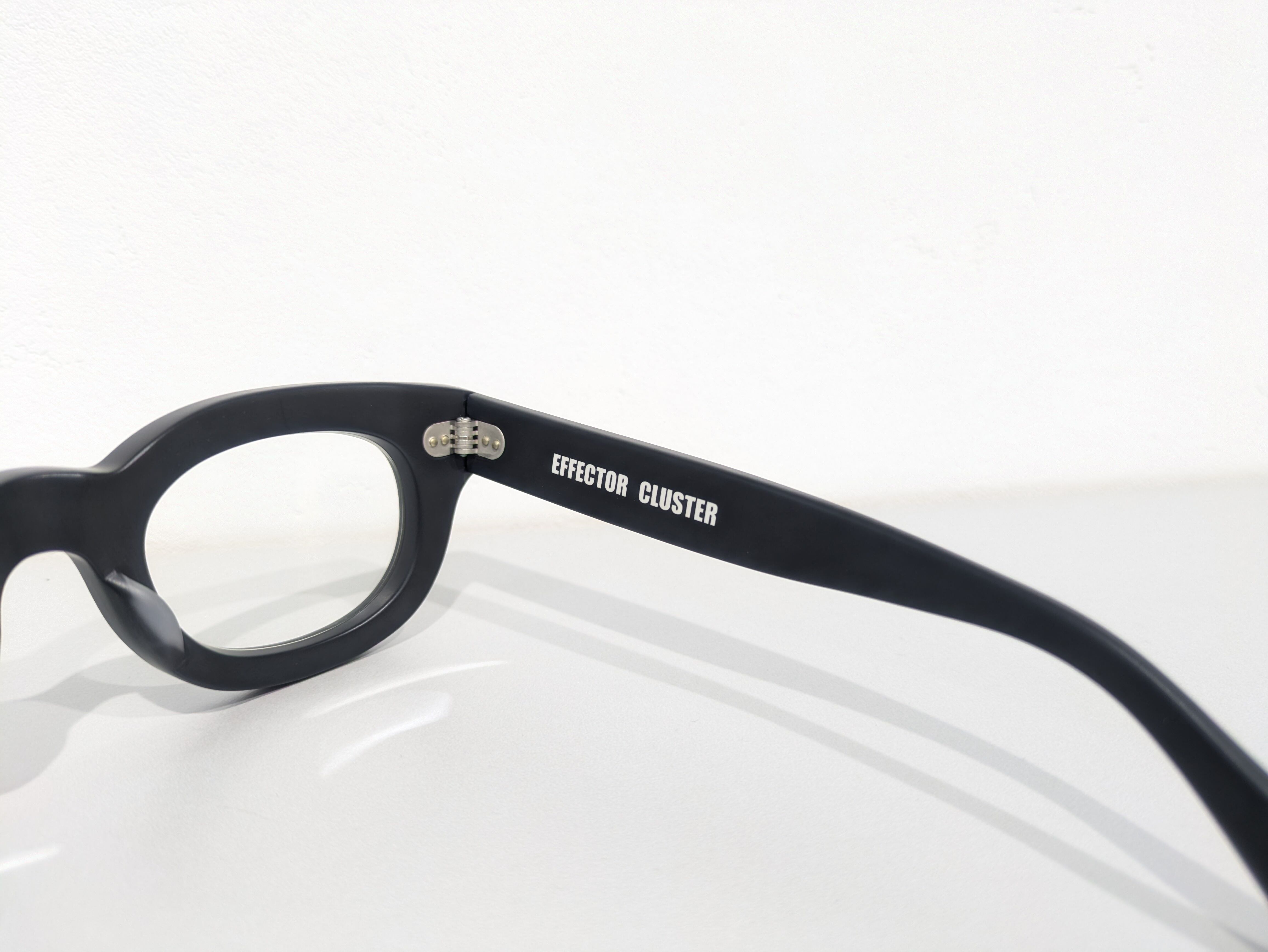 天地幅が浅めで丸みのあるウェリントンタイプ。ブローライン、飾り鋲など代表作“fuzz”の派生モデルといった趣です。テンプルの形状も“fuzz”から継承されフィット感が抜群。EFFECTORの中でもリム幅が広めでインパクト大。黒のマットな質感が新鮮です。