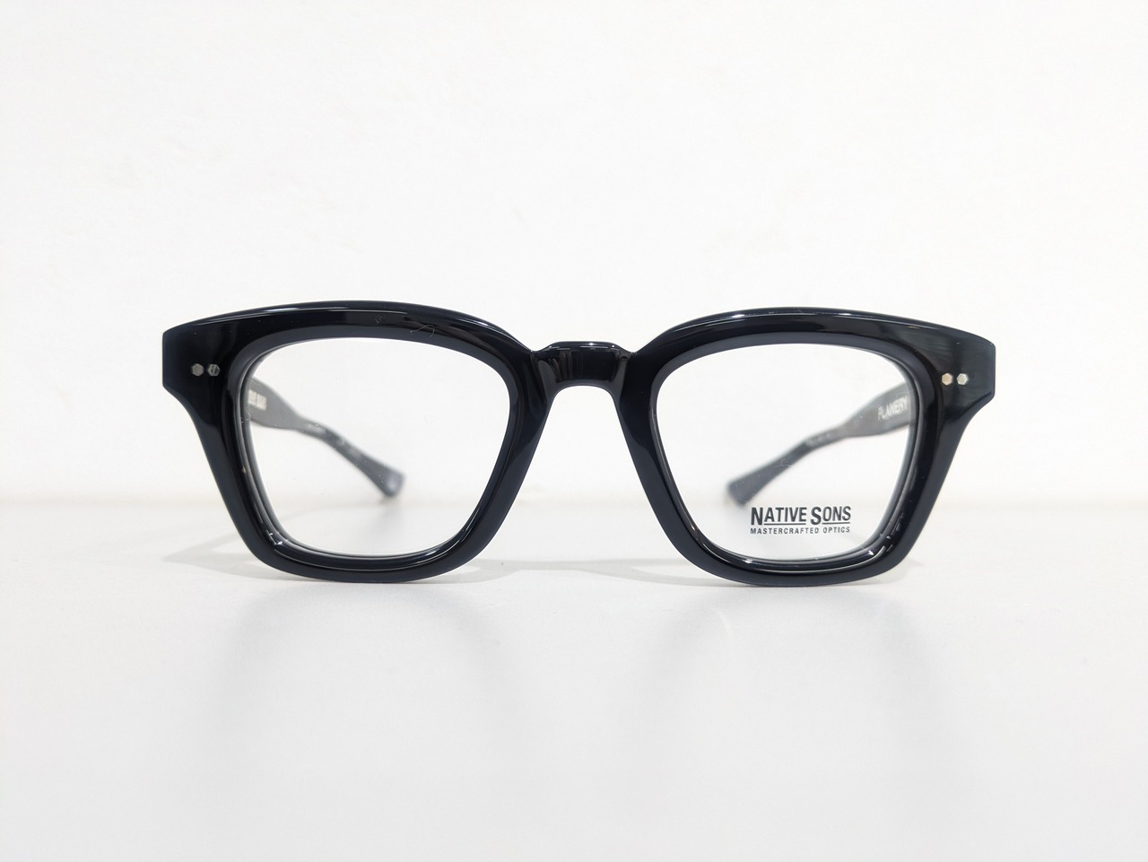 正統派ウェリントンのセルフレーム。大人の風格が漂いどっしりとした印象。やや天地幅が深めで緩やかに弧を描くブロウラインがすっきりしています。重厚感のある7mm生地でゆとりのあるサイジング。金属パーツを全てオリジナルで製作するなど徹底的に作り込まれています。