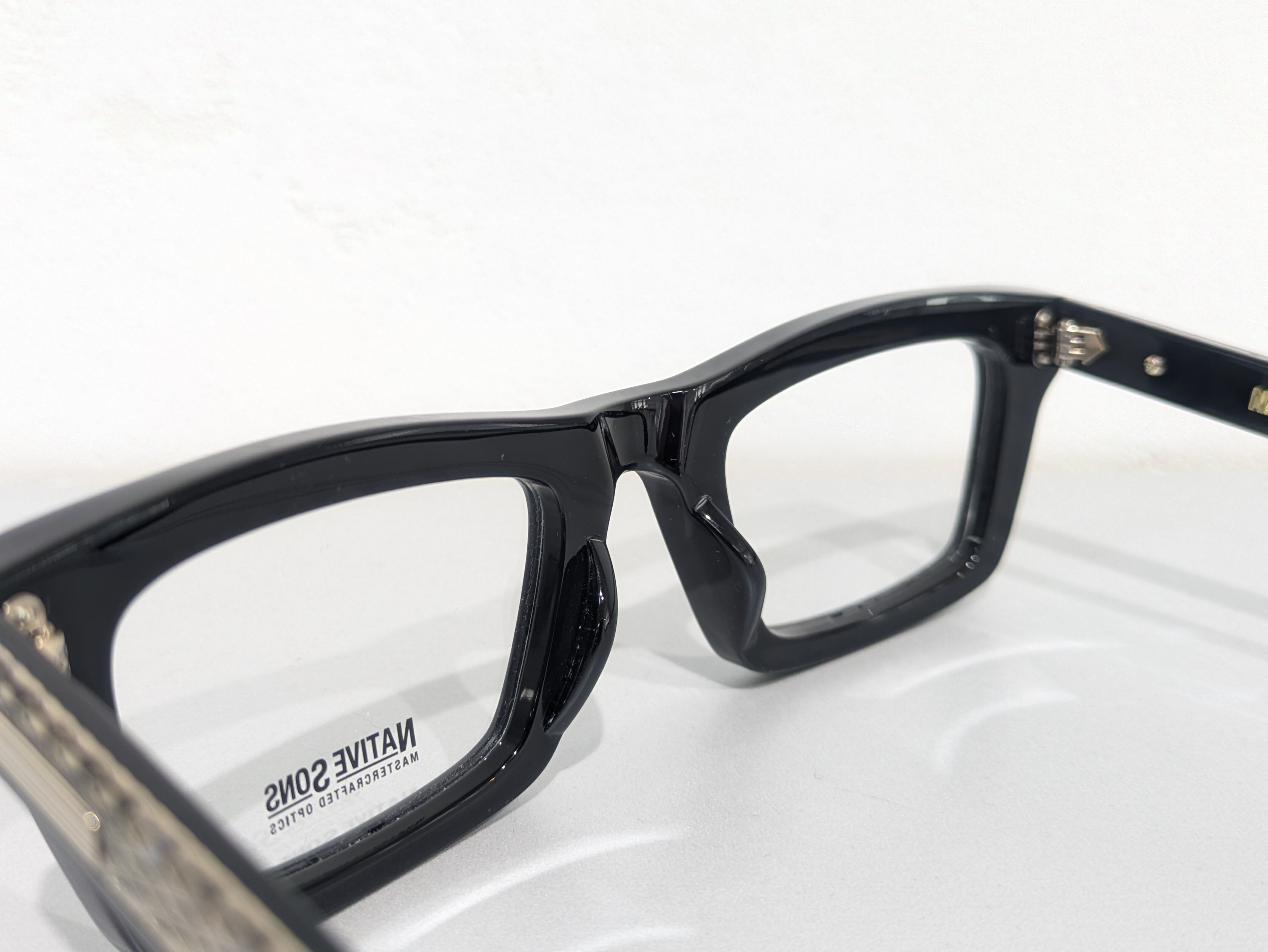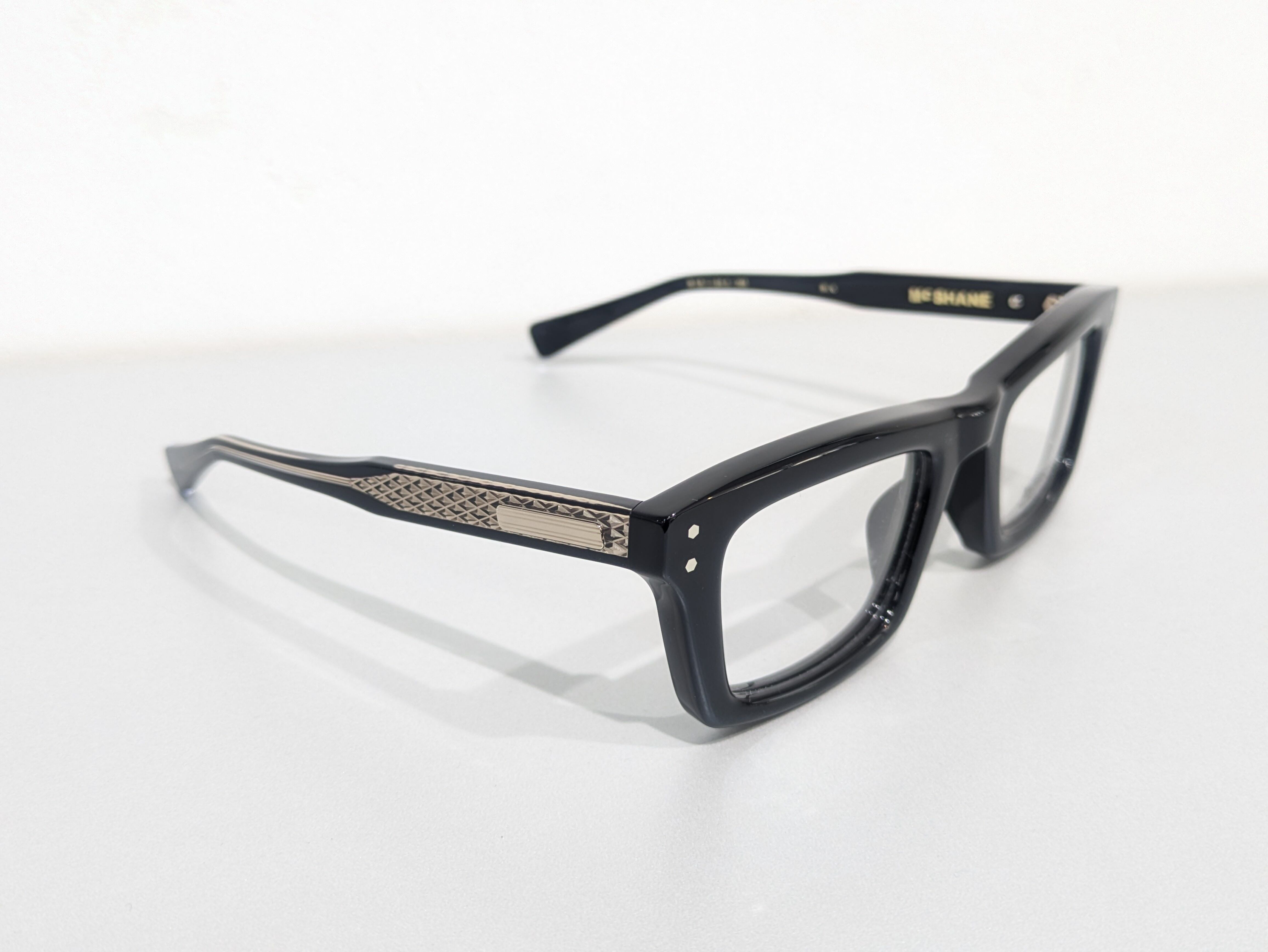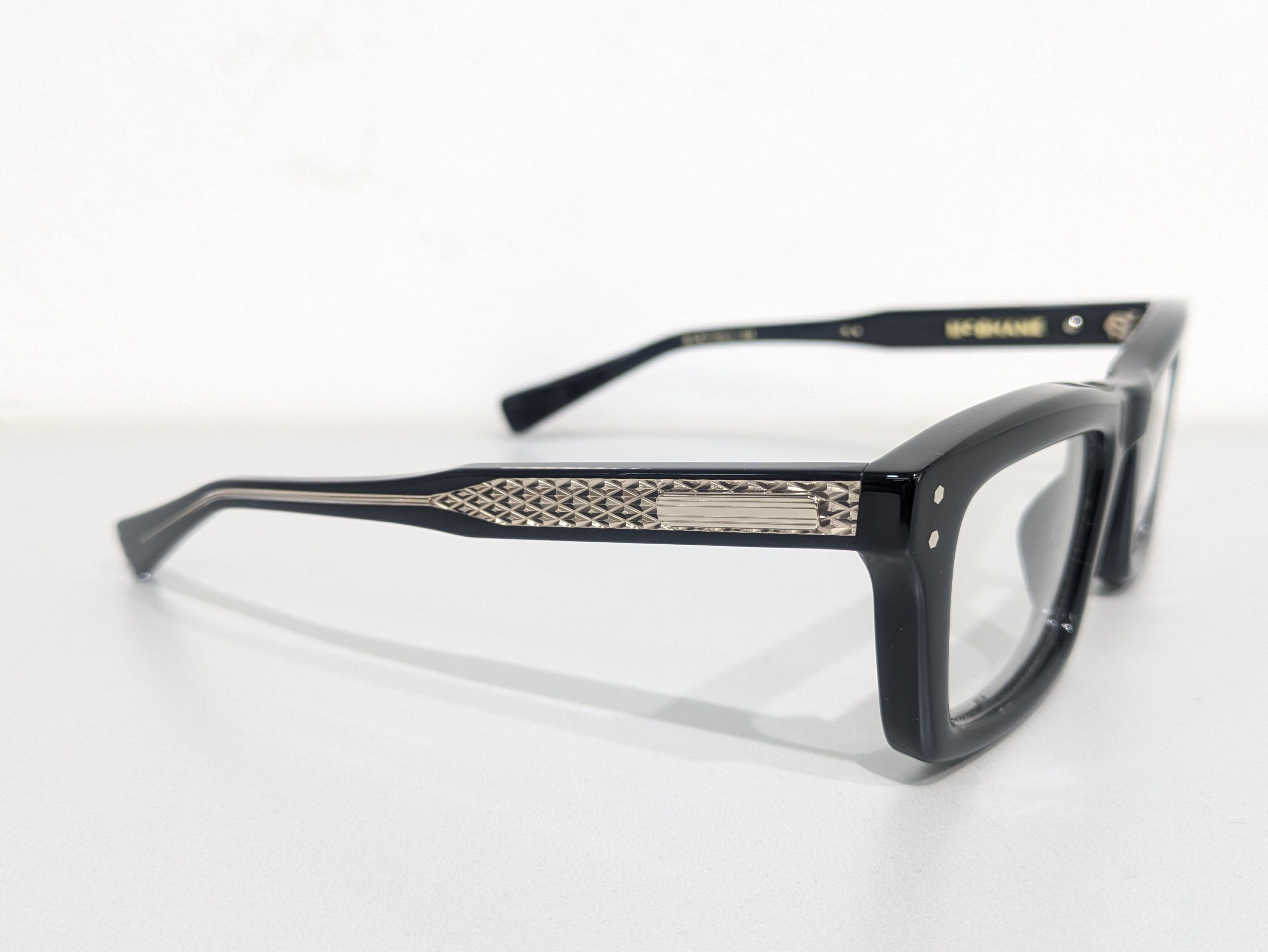 横幅が広くとても四角い形状でブロウラインにわずかなくぼみがあります。全体的にシャープで尖った雰囲気が漂っています。レンズ周りは1.6mmの深さのテレビジョンカットにより奥行き感を演出。テンプルは後方に向かって四角くなり形を整えながら耳に沿うように上下のバランスの違うテーパーラインを描いています。テンプルエンドは9mmの幅でスクエアオフ。調整しやすく抜群のフィット感です。コアワイヤーはダイヤモンド柄でさり気なく透けます。ブランドの象徴的なモーターヘッド型のチタンプレーンを配置。丁番もオリジナルで製作され5枚重ねでとても堅牢な作りです。ネジの緩みを防ぐためナットで固定。