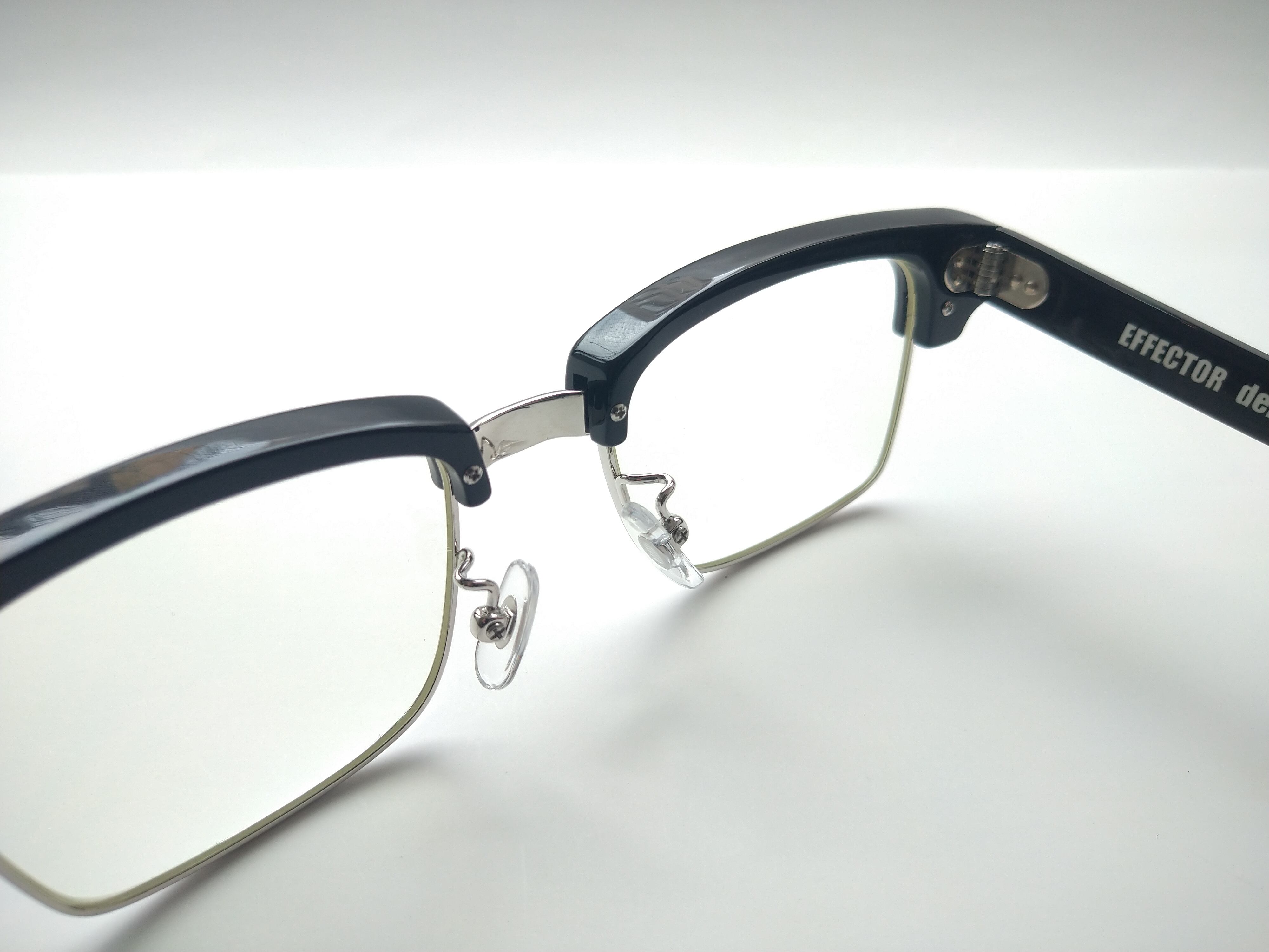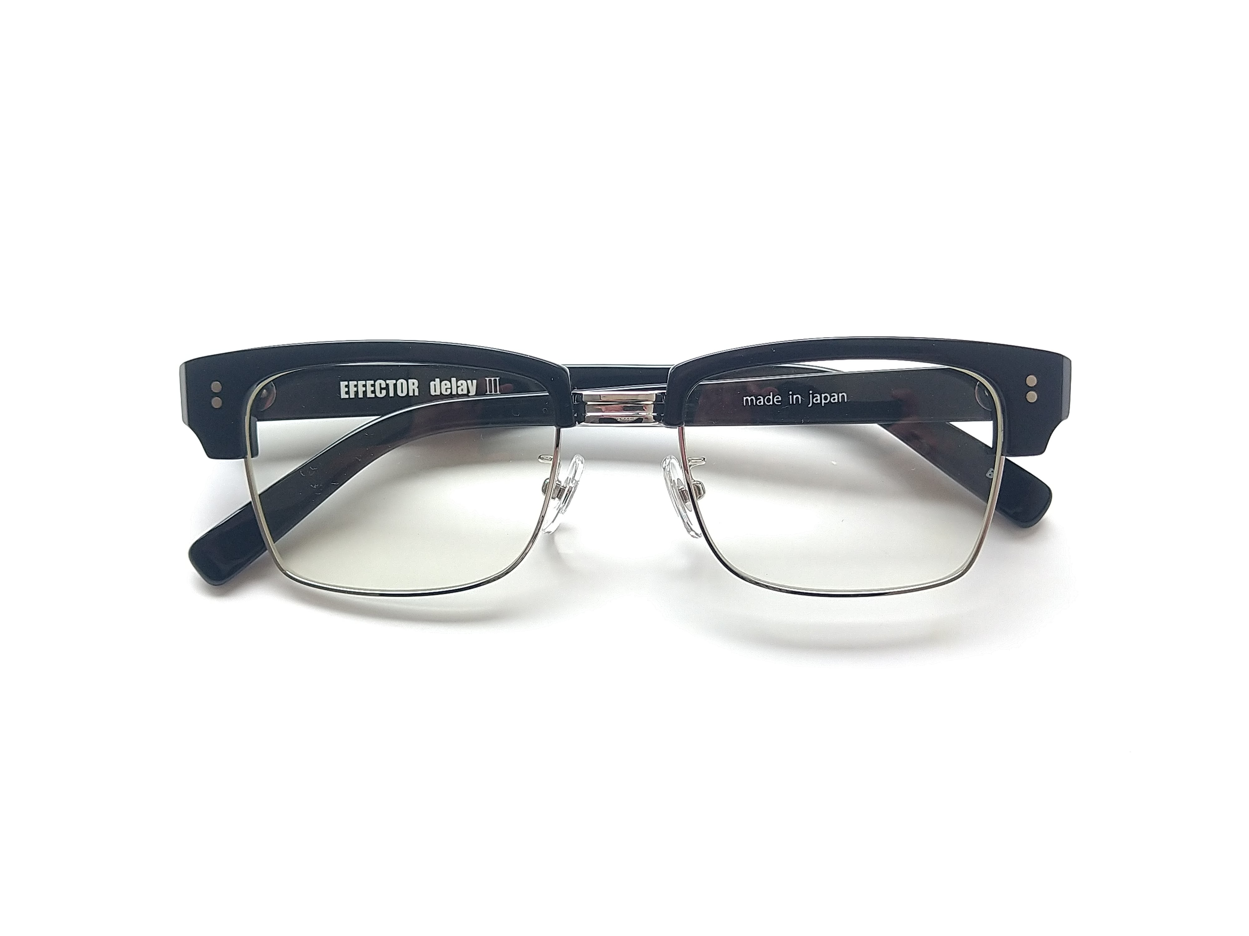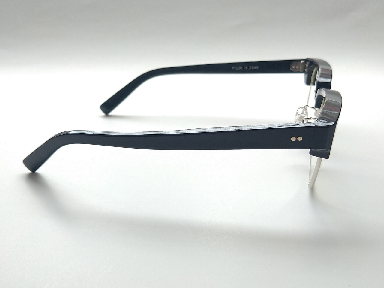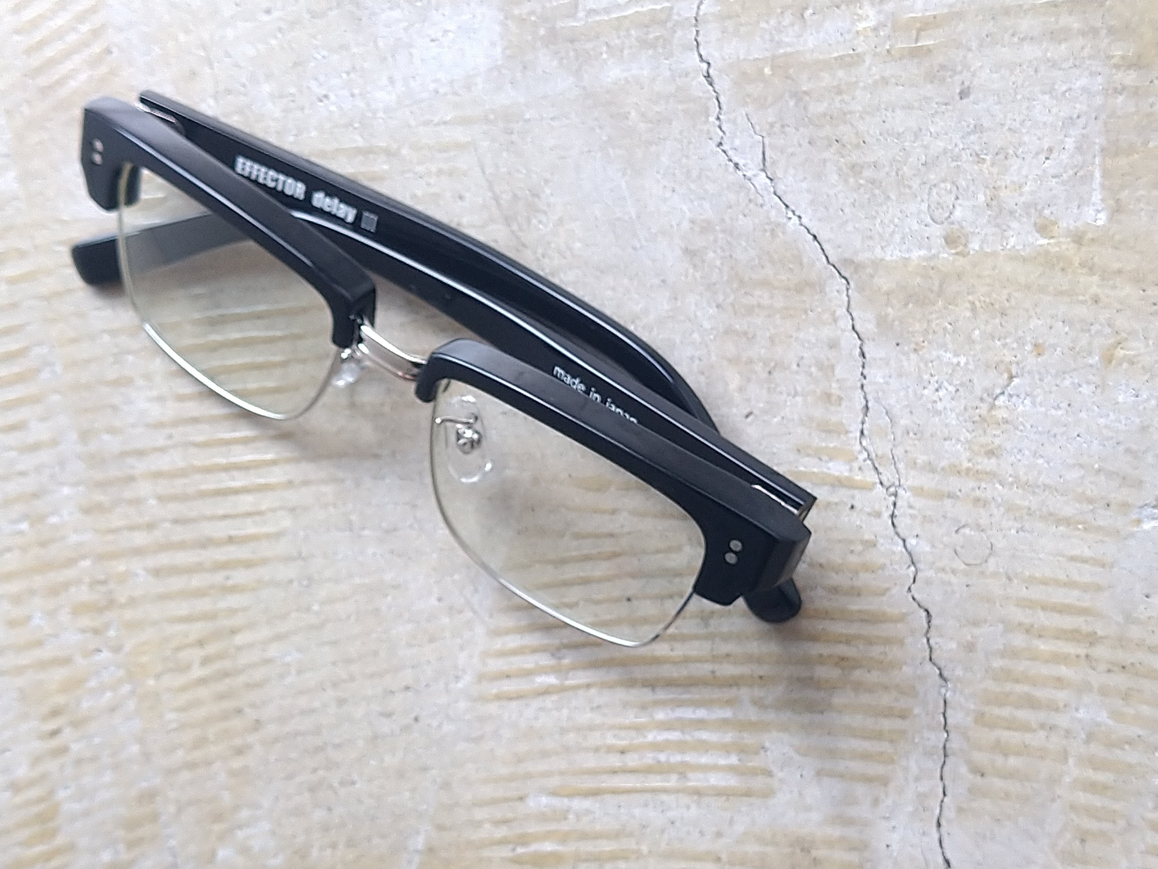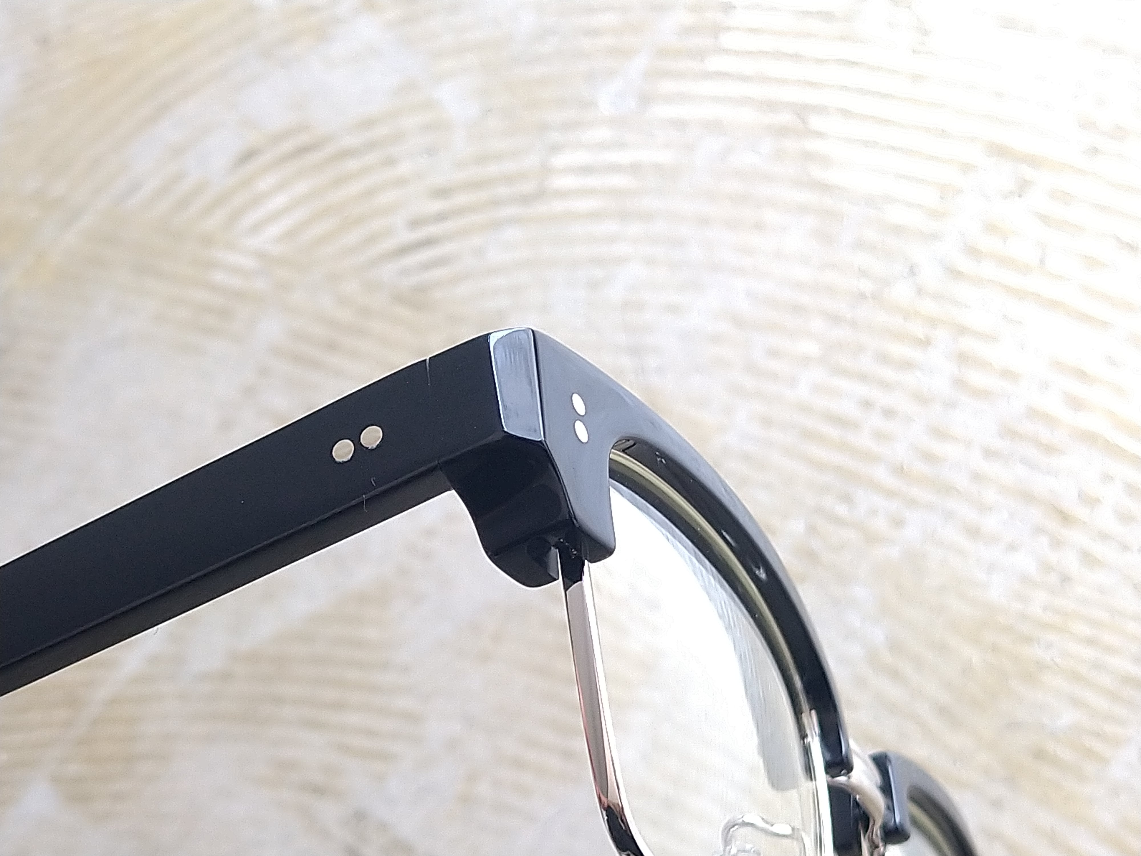 “delay2”よりスクエアなフォルムで、よりシャープで知的な印象の仕上がりです。アンダーリムにはメタル素材を採用。丁番は昔ながらの「カシメ丁番」で、フロントの2点の丸鋲がアクセントになっています。倉敷店
